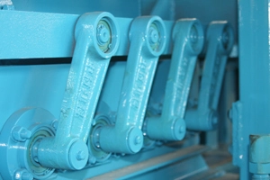 Се користи механизам за поврзување со рачки. Го пренесува кружното движење на рачката во директно взаемно движење на мобилната слава, ова обезбедува непречено движење на палетите и стабилно пренесување на производите.