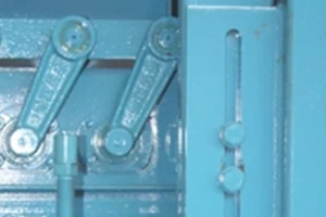 Синхрониот систем за расклопување, кој се движи со запчаници и синџири, прави двата цилиндри за расклопување да работат синхроно и ги тера калапите да се движат